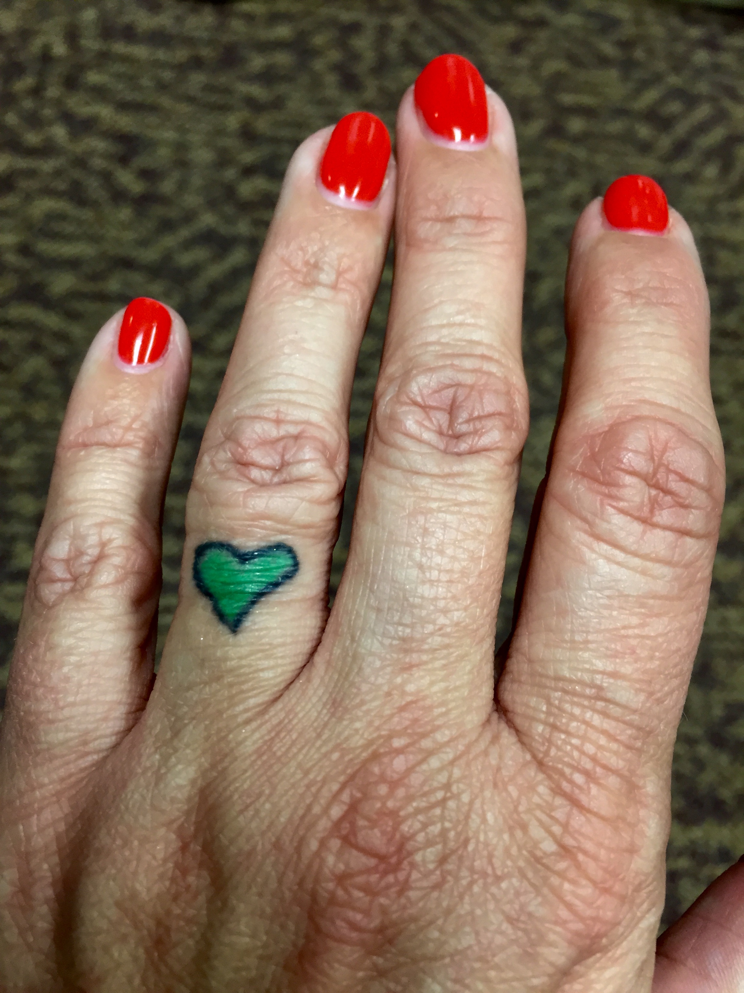 On top of my left ring finger is a small green heart. It is usually hidden by my wedding rings. This is for my husband, whose favorite color is green.