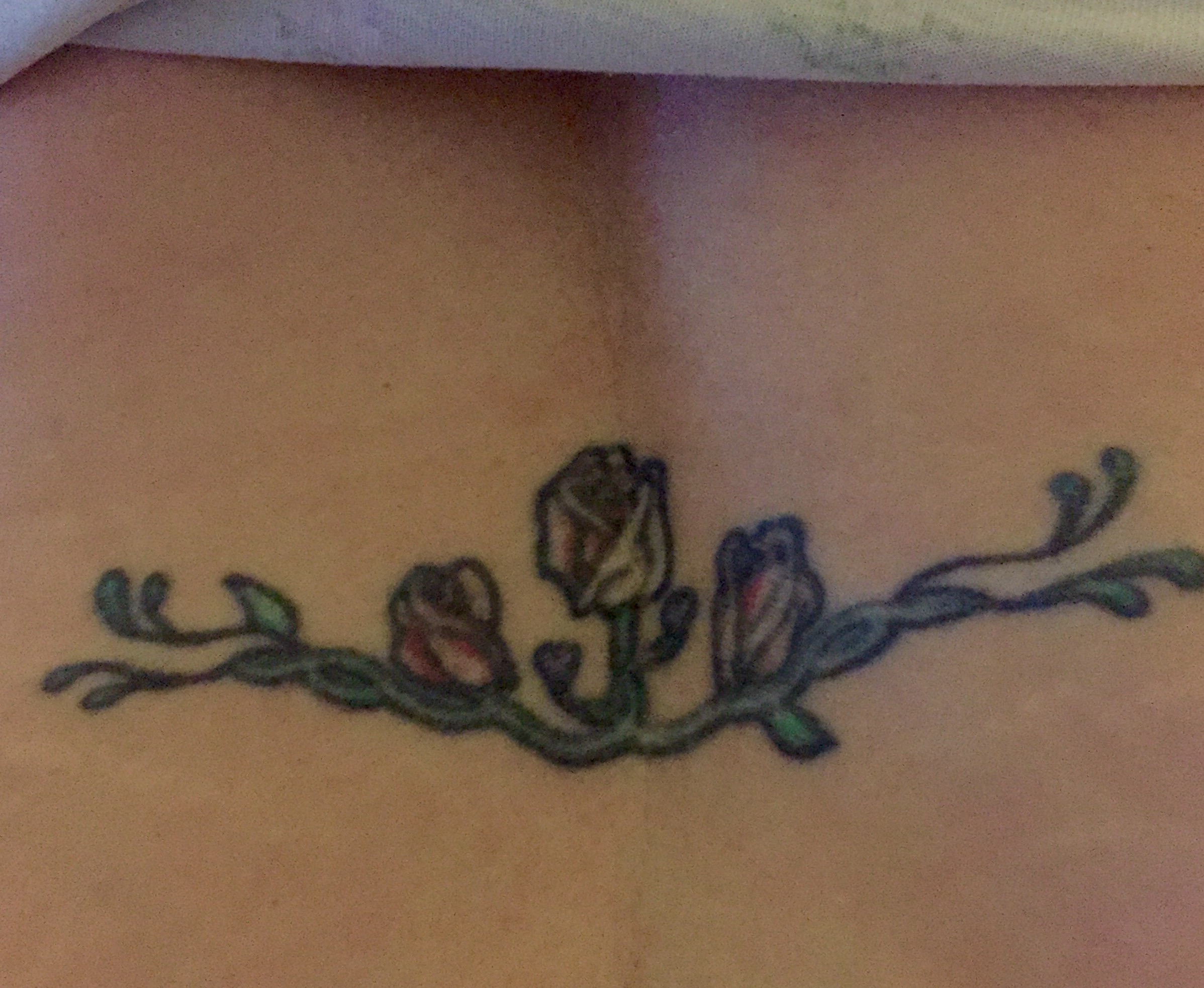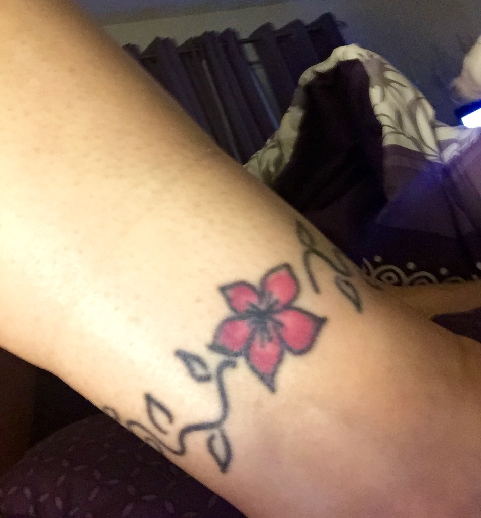I’ve got a tramp stamp of flowers. This was my most painful tattoo. When I got it, I lost some of the ink because the waistband of my jeans irritated the fresh tattoo. I once inquired about getting it touched up but that would require having the whole thing retouched and I’m not sure I want to go through that pain for a tattoo that only gets seen by my husband.