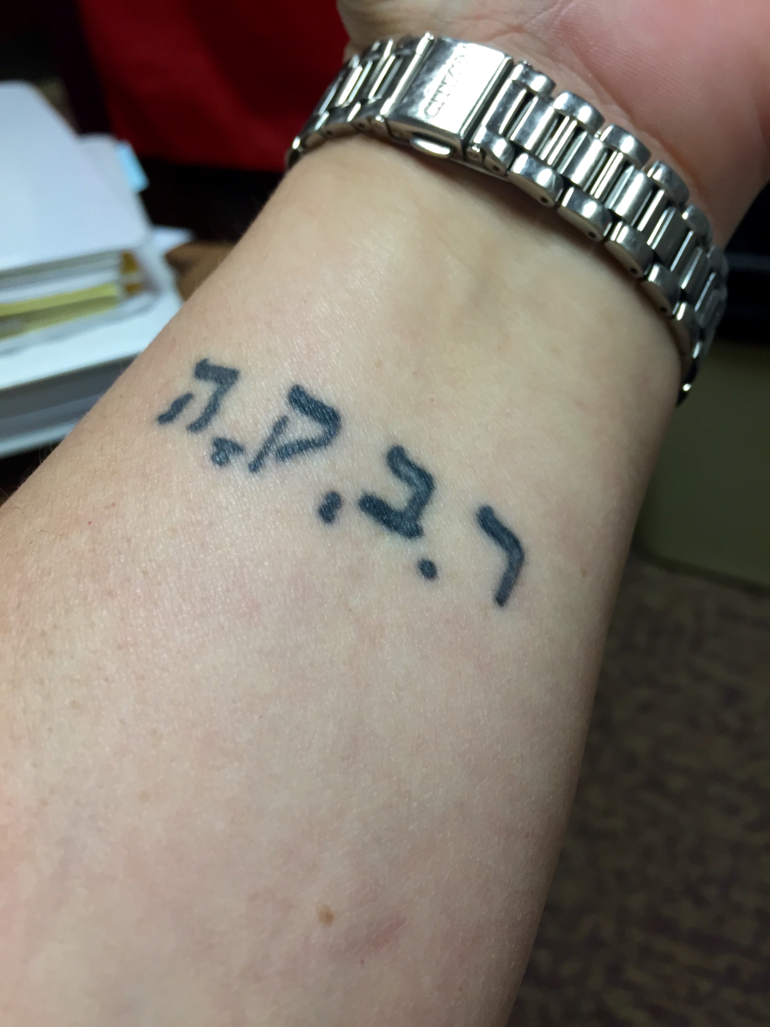 On my inside left wrist, I have my daughter’s name written in Hebrew. It is my favorite tattoo.