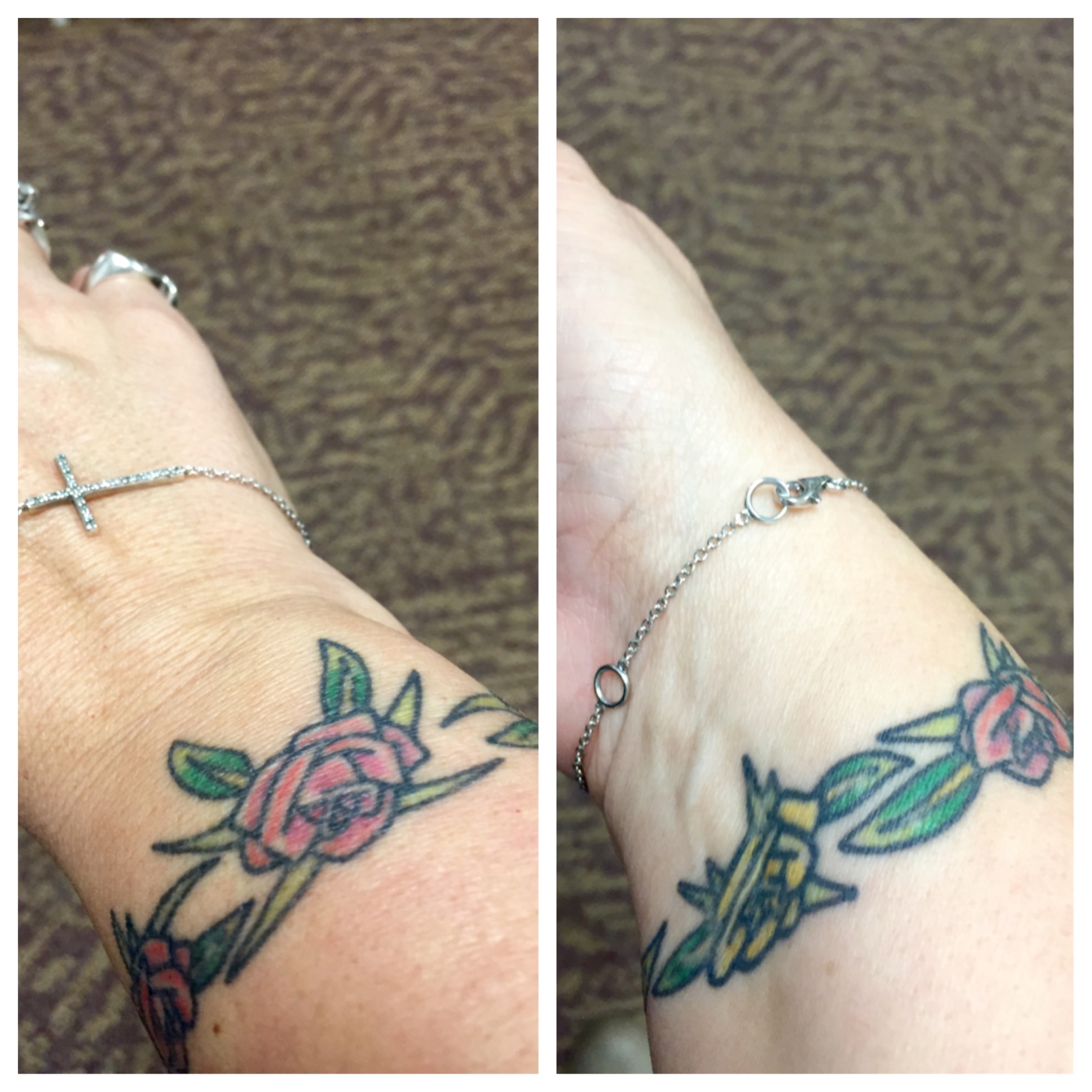 Around my right wrist is a bracelet of pink and yellow roses. Pink roses are my favorite flower; yellow roses are my mom’s favorite flower.