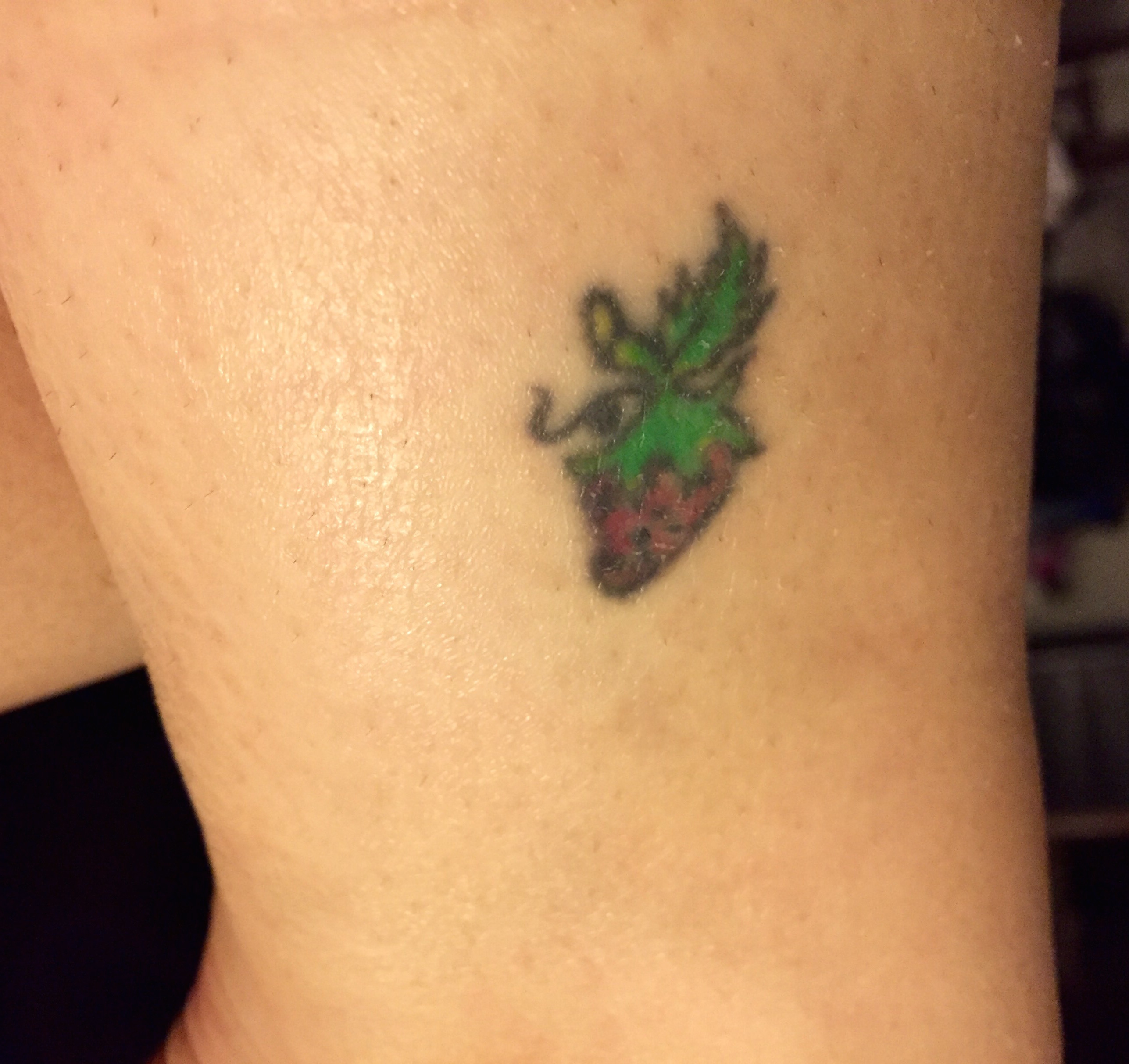 So my first tattoo was on the inside of my left leg just above my ankle — a small strawberry. I wanted something small in case it wasn’t well received at work. Nobody batted an eye and it was then that I began my love affair with tattoos.